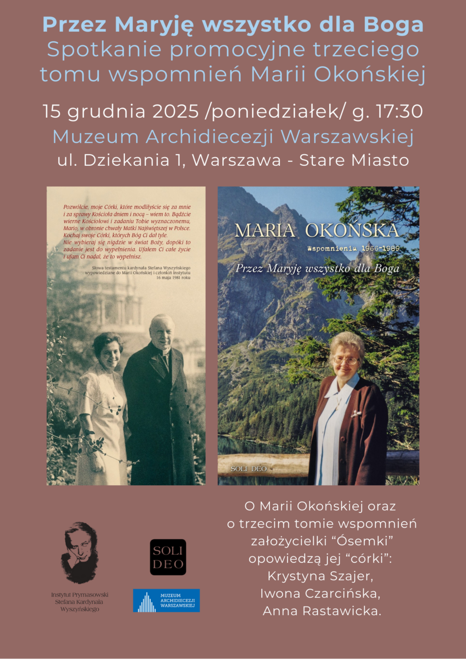 W przeddzień 105 rocznicy urodzin Marii Okońskiej założycielki “Ósemki”, zapraszamy na spotkanie z członkiniami Instytutu Prymasa Stefana Kardynała Wyszyńskiego, które przybliżą nam osobę Marii Okońskiej oraz zapoznają nas z wydarzeniami opisanymi w trzecim tomie wspomnień pt. “Przez Maryję wszystko dla Boga. Wspomnienia 1966 -1989”